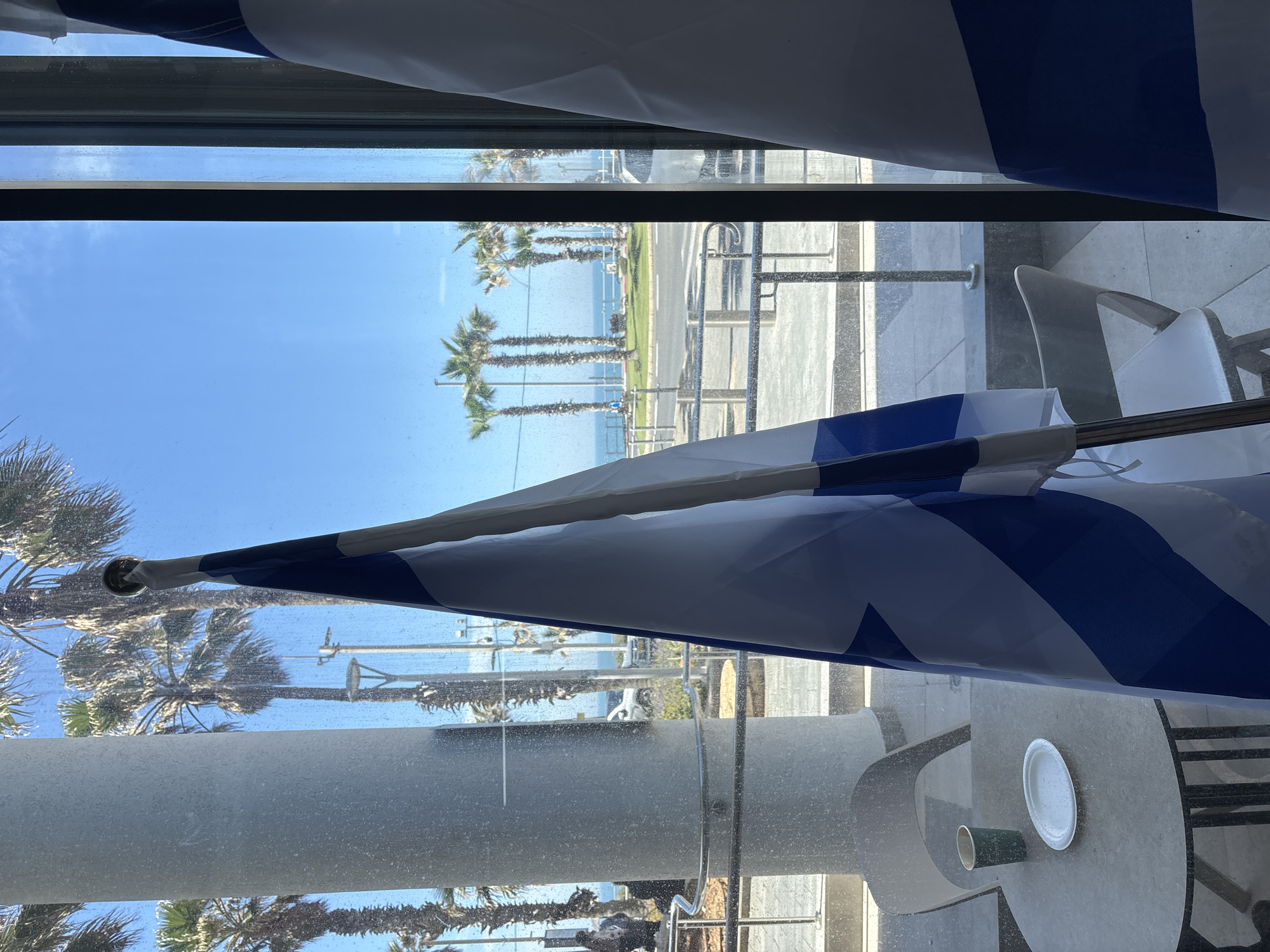 The image presents an interior view looking out through a large, somewhat dust-speckled window towards a sunny coastal environment in Bat Yam, Israel. In the foreground, positioned centrally, a vertical Israeli flag hangs, showing its blue Star of David and horizontal stripes against a white background, attached to a pole topped with a spherical finial. Another segment of an Israeli flag is visible on the far right. To the left of the central flag, a round, light-grey table is visible with a dark base, bearing a single green disposable cup and a small white oval paper plate. A light-grey chair is partially visible next to the table. A large, white cylindrical structural column stands prominently on the left side, appearing dirty with visible marks. Beyond the window, under a clear blue sky, a coastal road runs parallel to the beach and the Mediterranean Sea. Several tall palm trees line the road and green median strips. The road features a circular traffic island with green grass. In the distance, the calm blue sea stretches to the horizon. A few indistinct figures appear to be walking on a promenade or sidewalk near the column and metal railings on the far left. A white vehicle, possibly an SUV, is partially visible on the right side of the road, facing away from the viewer. Metal railings are visible directly outside the window, separating the interior space from the exterior. The scene is brightly lit by natural sunlight.