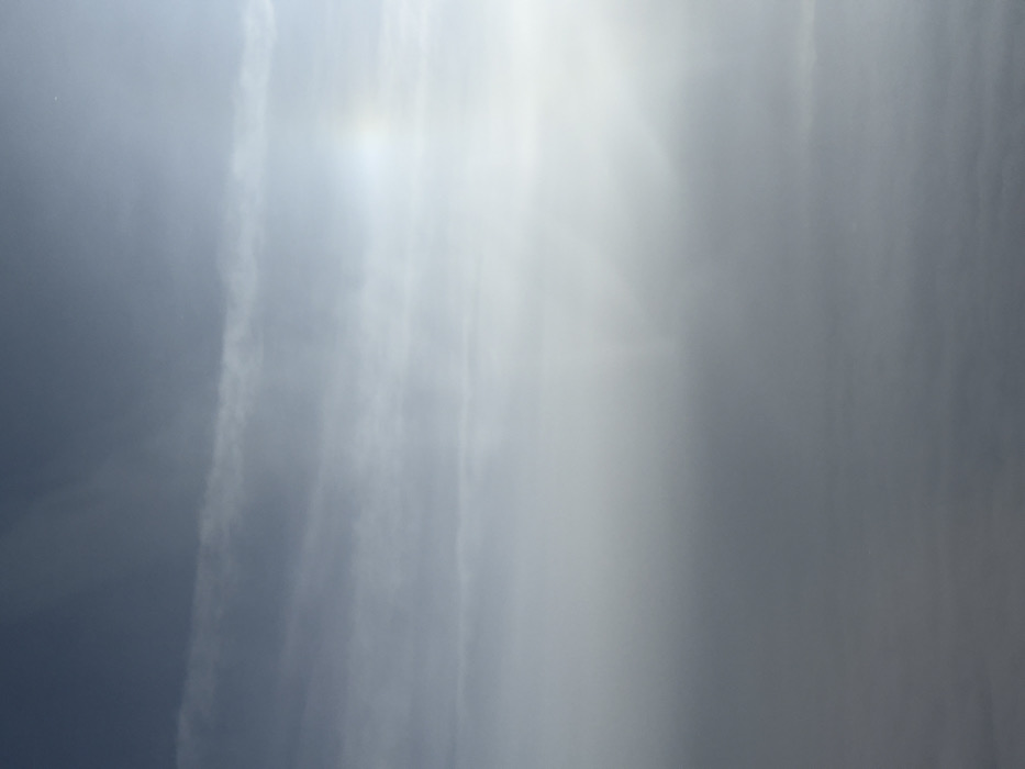 The image displays an atmospheric scene over Segrate, Italy. The upper portion of the frame features a sky with layered clouds and atmospheric haze, transitioning from a muted blue-gray at the top to lighter gray tones lower down. A bright, diffuse light source, consistent with the sun, is positioned in the upper right quadrant, emitting visible rays of light downwards and creating a faint halo effect around its origin. A narrow, horizontal cloud formation is visible in the upper-mid section. The lower third of the image is enveloped in a dense, uniform layer of fog or low-lying clouds, obscuring any ground features or distinct horizon. No human subjects, man-made objects, or discernible terrain features are present.