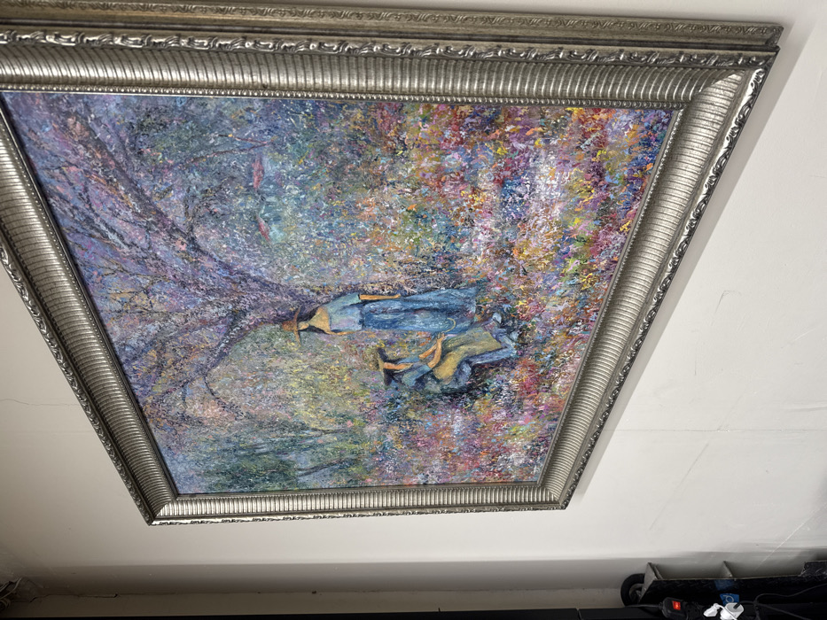 The image displays a large, vertically oriented oil painting presented in a prominent silver-colored ornate frame, affixed to a light-colored wall. The painting depicts an impressionistic or pointillistic landscape featuring two female figures amidst a vibrant field of multicolored flowers and dense foliage under a large, gnarled tree. One woman stands upright, dressed in blue with a wide-brimmed hat. The second woman is seated or crouched lower, wearing a similar hat and a light-colored dress, holding a string-like object. In the background, indistinct structures with reddish roofs are visible through the trees. The frame itself exhibits intricate decorative relief, including fluting and stylized patterns. The wall behind the painting shows several vertical cracks and minor scuff marks, particularly visible in the upper and lower left areas. To the immediate left of the painting, a portion of a dark, vertical structure, possibly a shelf or cabinet, is visible, along with an attached power strip holding multiple white electrical plugs and associated cables. This scene is located in the city of Tel Aviv, Israel.
