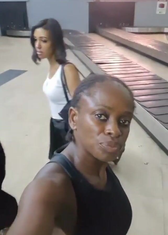 woman at an airport baggage claim area. She is wearing a black tank top and has her hair in braids. She is pulling a luggage cart and is carrying a sleeping baby on her back. A woman with short dark hair in a white top and black pants stands next to her. In the background is a baggage carousel. The lighting in the airport is bright. The woman seems to be talking to the camera about how much luggage she has.