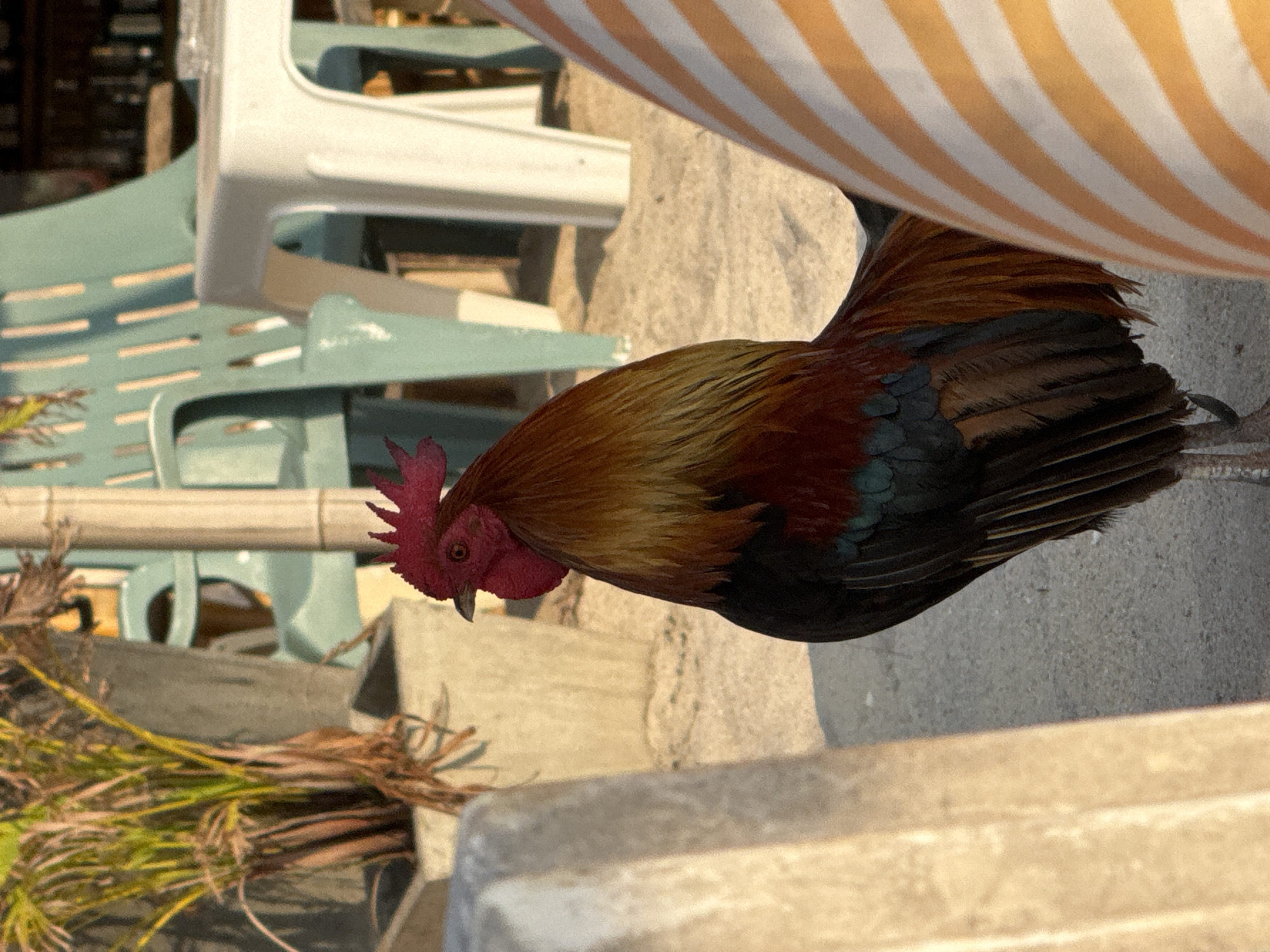 The scene depicts a multi-colored rooster standing on a light-colored, possibly sandy or gravel, surface in Choeng Thale, Thailand. The rooster is positioned centrally, facing slightly to the left with its head turned. It displays a prominent red comb and wattles, iridescent green-black body plumage, golden-brown hackle and saddle feathers, and reddish-brown tail feathers. Its dark eye is visible. In the immediate foreground, a light-colored concrete pillar partially obscures the left side of the frame, and a large object with distinct vertical orange and white stripes partially frames the right. In the mid-ground, behind the rooster, a potted plant with green and brown foliage resides in a dark gray or concrete planter. To the right of the plant, light green slatted plastic chairs and a white square plastic table are visible, with a small clear object, possibly an ashtray, resting on the table. The background is blurred, showing a darker interior space, potentially a bar, and a vertical light-colored pole. The environment is illuminated by strong, directional sunlight from the upper right.