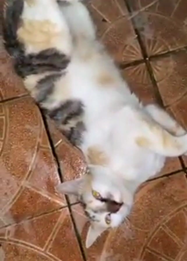 A cat lies on its back on a tiled floor. The cat is calico, with white, orange, and grey fur. The floor is composed of brown tiles with a circular pattern. The cat meows and moves its head and paws. The cat’s fur appears wet.