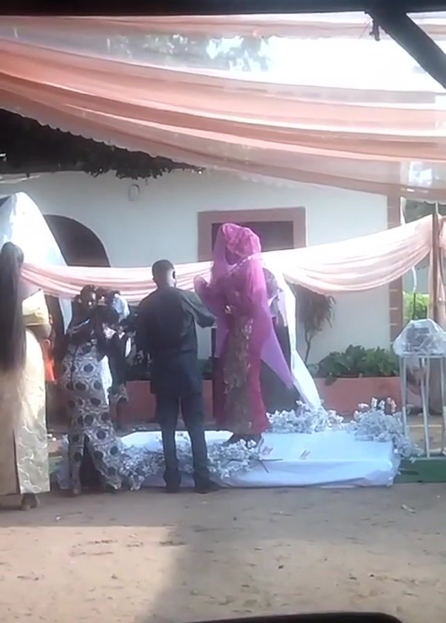 n outdoor wedding scene. A bride, wearing a patterned dress and a pink veil, stands on a platform decorated with white foliage. A man in a dark suit, presumably the groom, stands beside her. Several other individuals are nearby, including women in long dresses. The platform is covered with white fabric and set up under a canopy of peach-colored fabric. The background includes a building with a white facade and a brown doorway, as well as potted plants. The ground appears to be dirt. The camera is recording from underneath a dark, possibly corrugated roof.