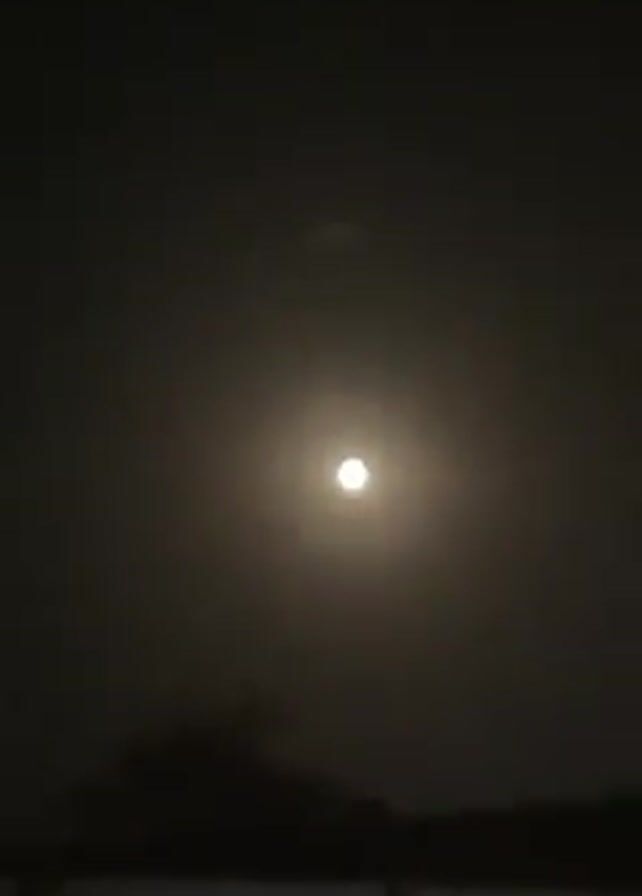 bright moon in the night sky. Initially, the focus is close-up, highlighting the luminosity. The view then zooms out to show the moon surrounded by a hazy atmosphere, with a hint of buildings and trees silhouetted against the dark background. A possible star can be seen above the moon. The overall impression is one of nighttime and atmospheric obscurity.