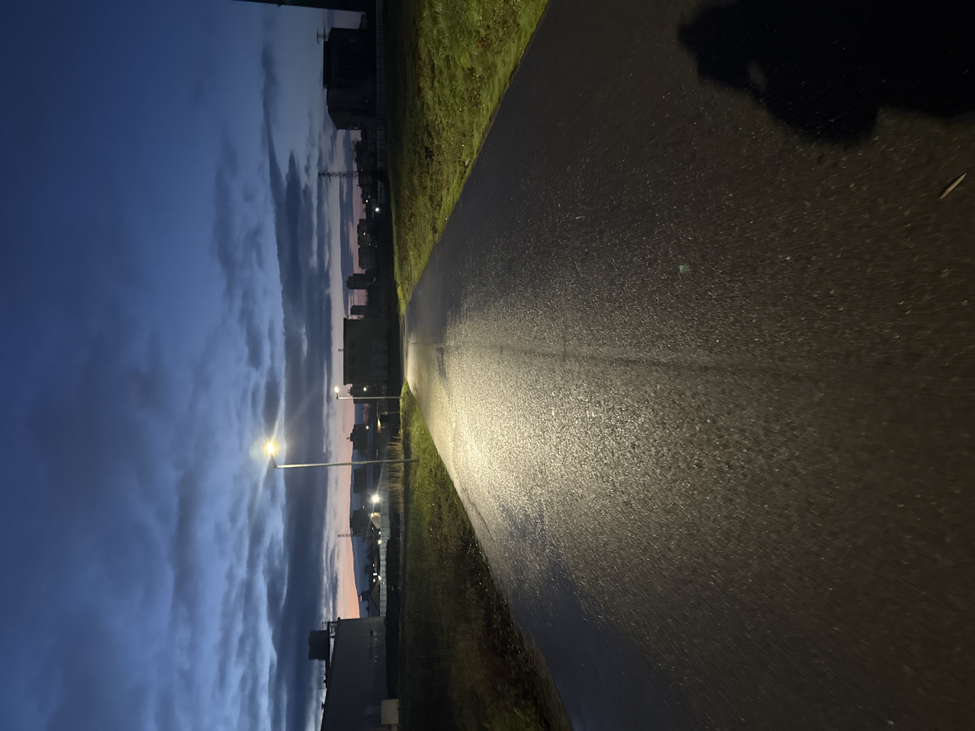 The image presents an outdoor scene depicting an asphalt road in an urban-industrial area of Yambol, Bulgaria, observed during twilight. The road surface is wet, exhibiting significant reflections from artificial light sources. A prominent street lamp, emitting a bright white-yellow light, stands on the left side of the road at approximately mid-distance, casting a strong, elongated reflection across the damp asphalt. Further down the road, additional street lamps are dimly visible. To the immediate left of the road, there is an unmaintained verge composed of dark soil and sparse vegetation. Beyond this, several low-rise, utilitarian buildings, including one with a visible water tank on its roof, are silhouetted against the sky. The right side of the road is bordered by a strip of green grass. In the background, numerous industrial structures and power transmission towers are silhouetted, partially obscuring the distant city skyline. The horizon displays a narrow band of orange-pink light, characteristic of either sunrise or sunset, underneath a dark blue sky heavily covered with grey clouds. Faint outlines of distant mountains or hills are discernible along the horizon. In the lower right foreground, a dark silhouette of a person, identifiable as the photographer holding a camera or phone, is distinctly cast onto the wet road surface.