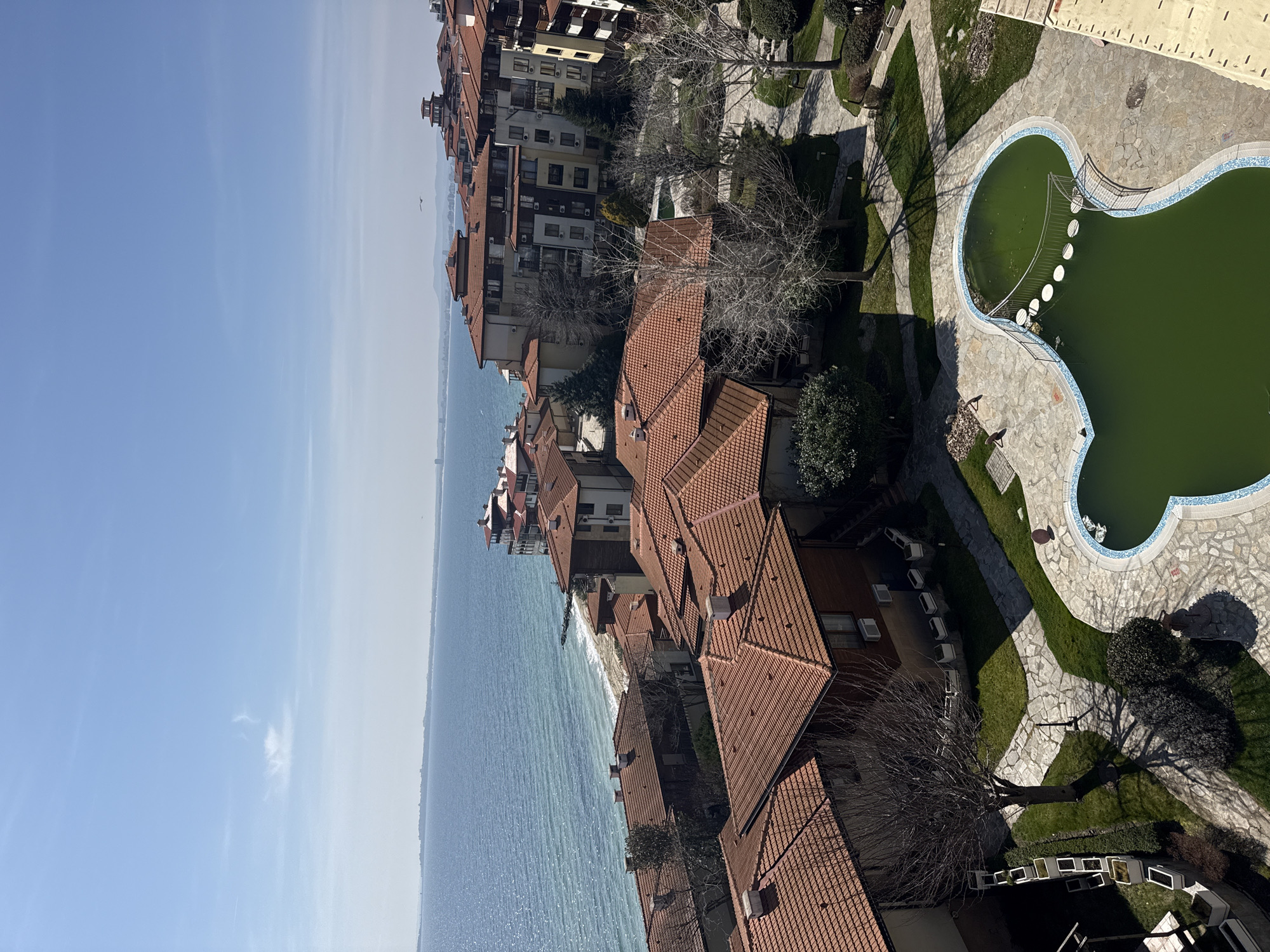 The image depicts an elevated view of a coastal residential complex in Sveti Vlas, Bulgaria, under a clear blue sky with minimal cloud cover