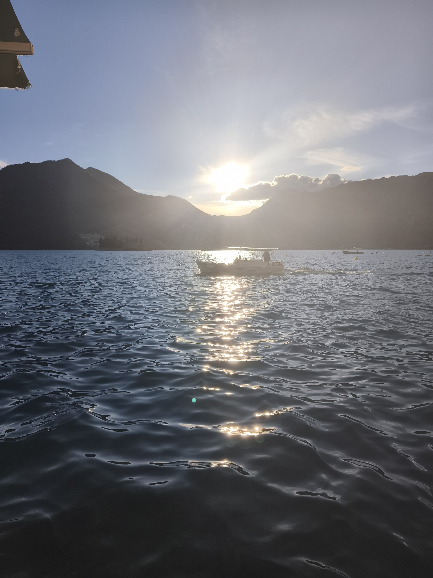 This photograph depicts a serene scene in Perast, Montenegro. The foreground is dominated by the rippling surface of the Bay of Kotor, reflecting the sunlight in a sparkling, fragmented pattern. A small boat is visible mid-frame, moving across the water with at least two people visible on board. In the background, silhouetted mountains frame the horizon, with the sun setting or rising between them, creating a bright glow in the sky. A few small buildings are visible on the mountain coast. The sky is a clear, light blue, with minimal cloud cover. The overall atmosphere is tranquil and illuminated by the sun.