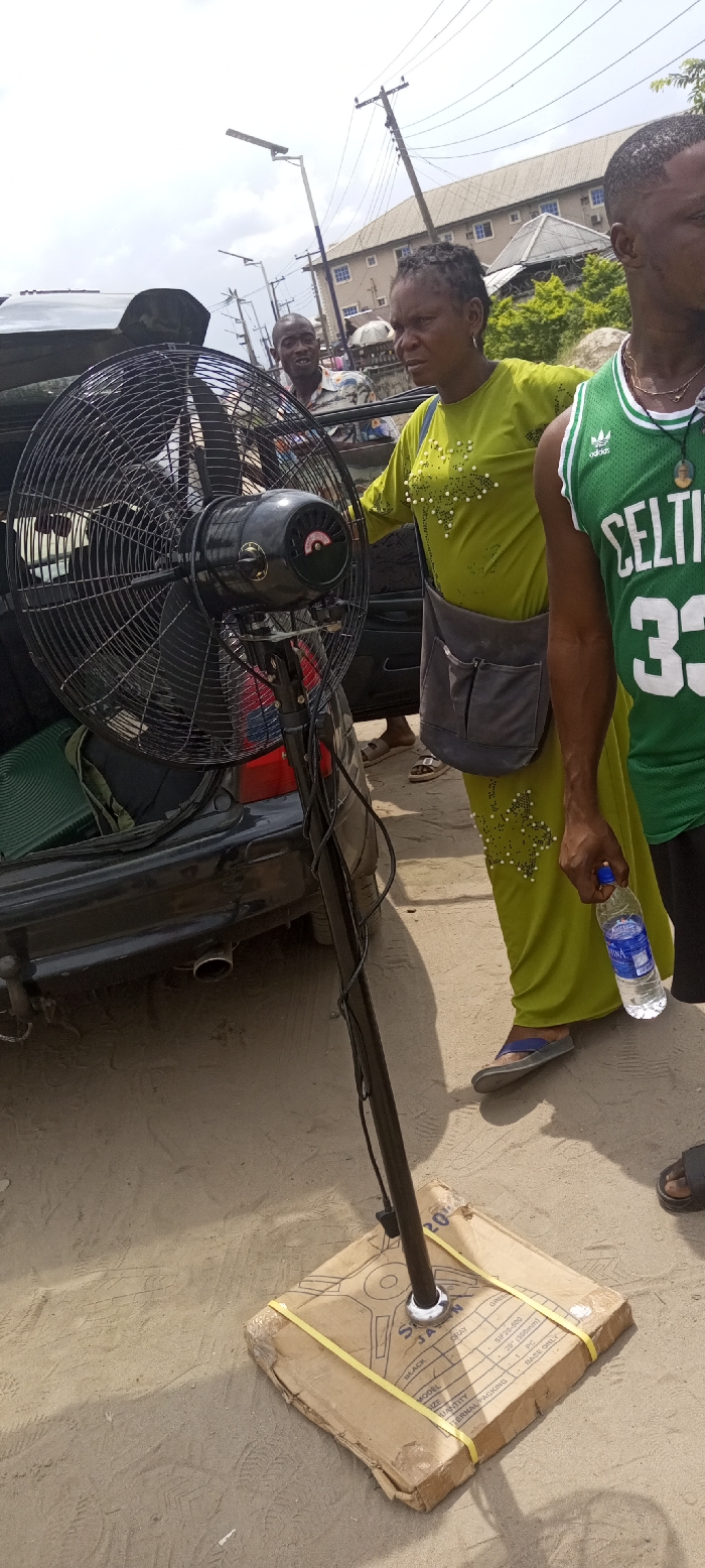 The scene is an outdoor, unpaved area in Ohoro, Nigeria, characterized by light brown, sandy ground and an overcast sky. Dominating the center foreground is a large, black industrial-style standing fan with a circular metal cage, mounted on a black pole. The fan's base is a cardboard box, secured with yellow strapping, displaying text including "SJF 20" and "JASON". Black electrical cords are wrapped around the fan's pole. Behind the fan, the open trunk of a dark-colored sedan reveals a folded green mat and other items. The vehicle's exhaust pipe and a tow hitch receiver are visible. To the right of the fan and car, a woman with dark, textured hair wears a long, lime-green dress adorned with white pearl-like embellishments and carries a grey shoulder bag. She wears light-colored flip-flops. To her right, a man with dark skin is partially visible, wearing a green basketball jersey with "CELTICS 33" and an Adidas logo. He holds a clear plastic bottle of Aqua Fina water in his right hand and wears dark sandals. To the left and slightly behind the fan, a third man, partially obscured, wears a patterned short-sleeved shirt and looks towards the camera. The background features several utility poles with overhead wires and two streetlights, one appearing to be solar-powered. Multiple buildings are visible, including a multi-story structure with a grey roof and blue-tinted windows, interspersed with green foliage.