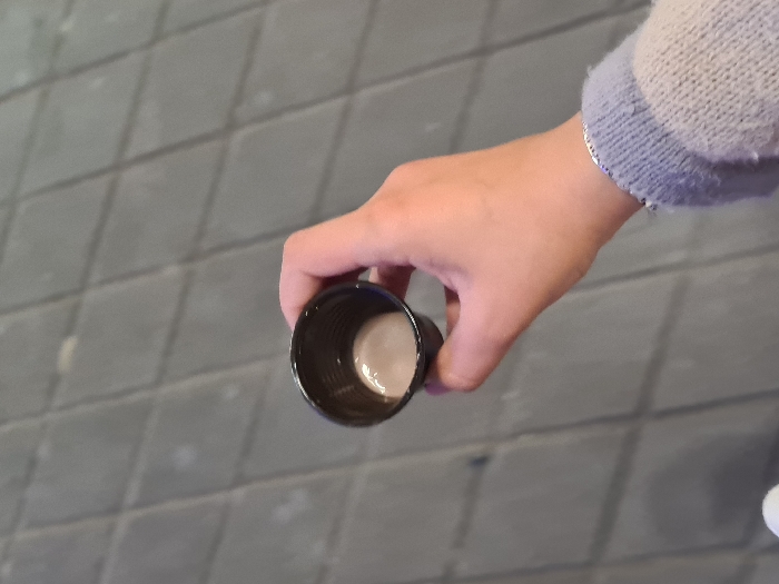- "The image depicts a human hand holding a small, dark-colored cup containing a light brown liquid, observed from a top-down perspective against a paved ground background" by FM-9VsWL2, licensed under CC BY 4.0