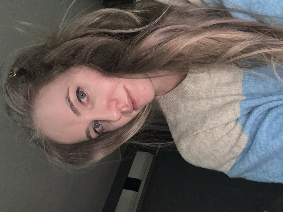 An indoor, close-up photograph depicts a fair-skinned female with long, wavy, light brown hair and blue eyes, looking directly at the camera with a subtle smile