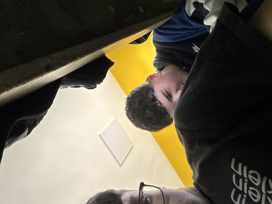 The scene depicts an interior setting in Kardzhali, Bulgaria, observed from a low vantage point, likely from beneath a piece of furniture. Two males are present. In the left foreground, the partial face of a male wearing glasses and dark hair is visible. He is wearing a black garment with inverted white text, potentially "Calvin Klein." To the right, another male with short, dark, curly hair and a young facial appearance is visible, looking towards the camera. He is wearing a black and blue hooded sweatshirt with a white Nike logo on the chest. The upper portion of the frame is occupied by the dark, textured underside of a structure, possibly a bed frame or shelf, from which dark fabric hangs. The background features a bright yellow wall transitioning to a light-colored ceiling. A rectangular, recessed light fixture is centrally located on the ceiling. The individuals appear to be positioned in a casual, confined manner within the room.