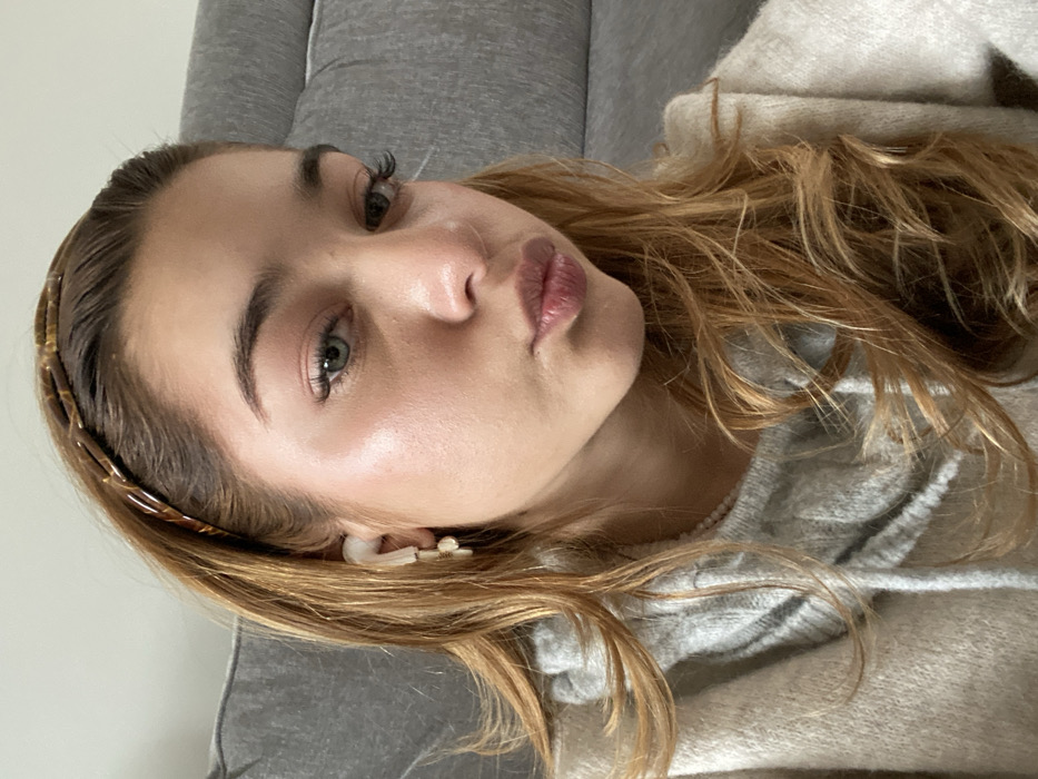 A close-up, chest-up portrait depicts a young female indoors, positioned within a residential setting in Täby, Sweden. The subject has light brown hair with blonde highlights, styled with a tortoise-shell patterned headband and falling over her shoulders. Her complexion is fair with prominent highlights on the cheekbones, and she has light blue-green eyes. Her lips are pursed in a slight "kissing" expression. A white wireless earbud is visible in her left ear, along with a light-colored earring featuring a circular stud and two small spherical drop elements. She is wearing a light-colored, possibly beige, fuzzy sweater over a light grey ribbed hoodie, with the hoodie's hood and drawstrings partially visible. The background is softly blurred, showing a grey upholstered object, likely a sofa or cushion, to her right, and a plain light-colored wall to her left. The subject is looking directly at the camera.