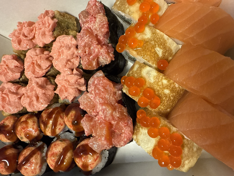 The image displays an overhead view of a diverse assortment of sushi rolls and nigiri presented in a white, rectangular takeout container. In the upper left, approximately eight pieces of baked sushi rolls are visible, each topped with a light orange-pink creamy sauce and drizzled with a dark brown, glossy glaze. To their right, approximately seven to eight additional sushi rolls feature a prominent, textured, piped light pink creamy topping, with some showing a golden-brown, possibly fried, base. In the lower center, two gunkan maki are present, each featuring a generous mound of finely chopped, vibrant pink-red fish (likely tuna or salmon) mixed with a creamy white substance, contained within a nori wrap. Below these, four rectangular pieces of sushi, potentially tamago (egg omelet) rolls, are topped with clusters of spherical, translucent orange salmon roe (ikura). The lower right section of the container showcases several pieces of sushi topped with slices of raw, orange salmon, exhibiting characteristic striations. The sushi items are neatly arranged within the white container, which serves as the primary visual background. No individuals, actions, or interactions are depicted. While the city of Chaikovsky, Russia, was specified, no visual elements within the image itself confirm this geographical location.