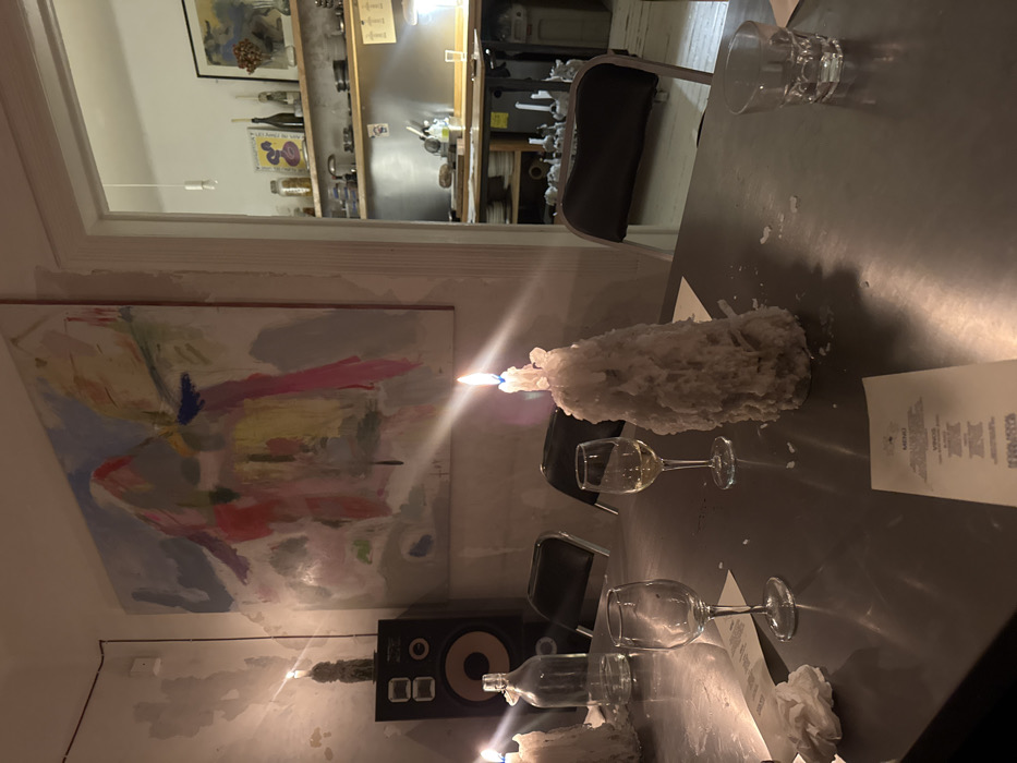 A dimly lit interior showcases a dining table adorned with melting candles, wine glasses, and a menu. An abstract painting hangs on the wall above a speaker. The room opens into a kitchen area with shelves and equipment. The scene evokes a sense of intimate dining in a rustic or artistic setting.