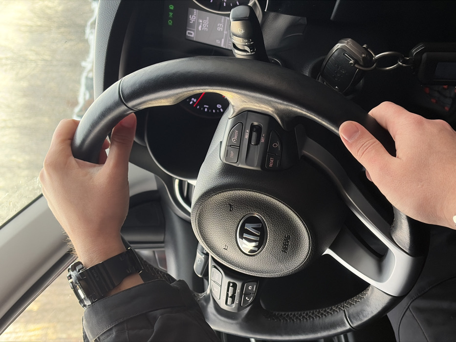 - "A pair of hands grips a black leather-wrapped KIA steering wheel inside a vehicle in Kronstadt, Russia" by FM-Opnib2, licensed under CC BY 4.0