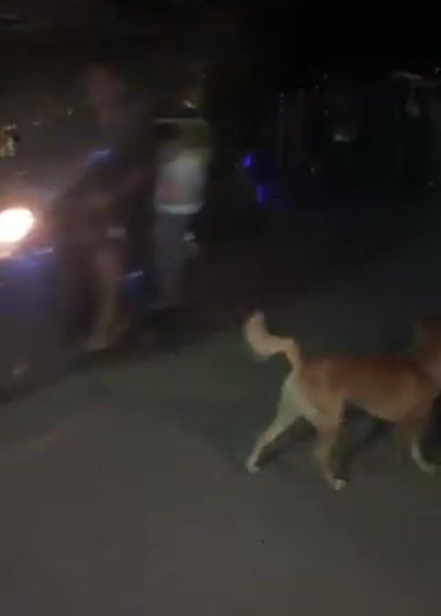 light brown dog running across a dark road at night
