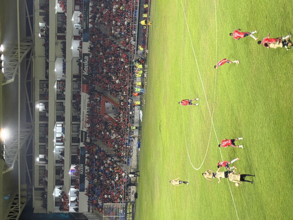 A soccer match unfolds on a green field, with players clad in red and gold uniforms engaged in gameplay. A referee oversees the action. Crowds fill the stands of a large stadium, packed with spectators in varying hues, and banners display company logos, adding to the stadium's atmosphere. Bright stadium lights illuminate the scene, highlighting both the players and the vibrant atmosphere of the event.