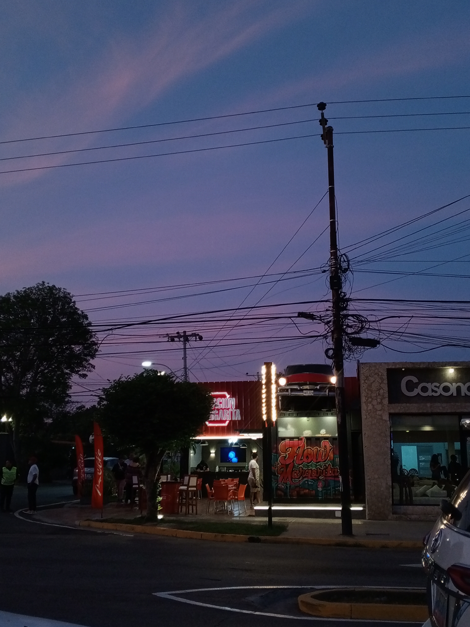 The photograph depicts a street scene in what appears to be Pampatar, Venezuela, under a twilight sky exhibiting pink and purple hues. Overhead, a dense network of electrical wires crisscrosses the view. On the left side of the frame, people are standing near red Coca-Cola banners and an outdoor restaurant with lit signage that reads "Seccion Margarita". A light pole laden with tangled wires stands tall on the right side of the restaurant. Next to the restaurant is a building with the name "Casona". A white vehicle is partially visible on the bottom right of the image.