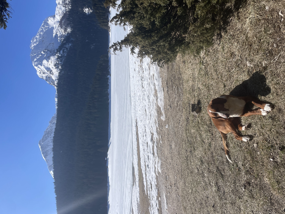 The scene depicts a natural landscape, identified as Black Lake (Crno Jezero) near the village of Pitomine, Montenegro. In the foreground, a medium-sized dog with a brown body, white chest, muzzle, and paws is lying prone on dry, sparse grass, facing slightly left. Its front paws are extended and crossed. A small dark rock is visible to the left behind the dog, and a segment of a green coniferous shrub is on the right. The ground exhibits patches of soil amidst the grass. Shadows indicate bright, direct sunlight. The midground features a large body of water, predominantly covered in ice and snow, reflecting the clear blue sky. Areas of melting snow and ice are visible along the shoreline. In the background, a dense coniferous forest with dark green trees covers the lower slopes of two distinct snow-capped mountains. These mountains dominate the distant horizon under a cloudless, vibrant blue sky. A sun flare is present in the upper left portion of the sky. No human subjects are visible in the image.