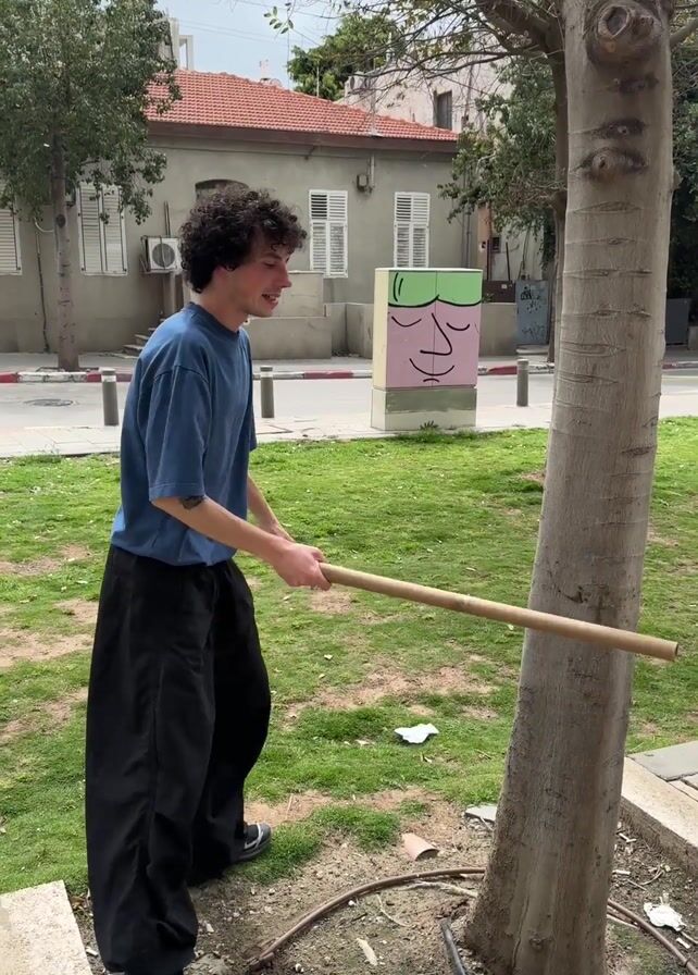 A young man with curly hair is standing outside, next to a tree in a park. He is wearing a blue t-shirt, black pants, and black sneakers. He holds a long, wooden stick and taps it against the tree trunk. He smiles and looks upward after tapping the tree. The background shows a grassy area, a building, a painted concrete block with a face on it, and street bollards along the sidewalk. The weather appears overcast.