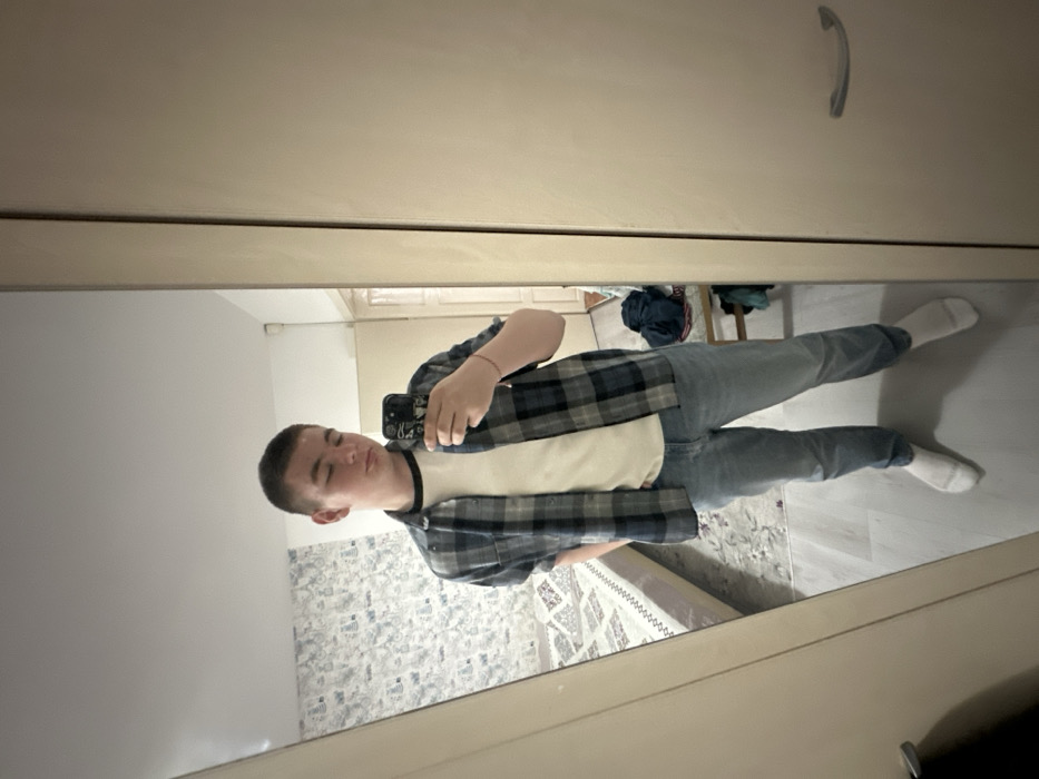 An image captured in General Toshevo, Bulgaria, depicts a young male individual standing in front of a full-length mirror, appearing to take a selfie. The subject, with short, light-colored hair and a light complexion, is dressed in a light-colored t-shirt with a dark collar, an unbuttoned blue and grey plaid short-sleeved shirt, light blue denim jeans, and white socks. His right hand holds a black-cased smartphone towards the mirror, while his left hand is placed in his left pants pocket. The subject's mouth exhibits a slight pout. The reflected environment behind the subject reveals an indoor setting. To the left, a bed with a patterned white and dark-colored bedspread is visible. The wall above the bed is covered with light blue and white patterned wallpaper. To the right, a light-colored wooden wardrobe or cabinet featuring a horizontal silver handle is present. A light-colored stool or chair with dark blue fabric or clothing items draped over it is partially visible near the wardrobe. The floor is covered with light grey laminate, with a section of a grey and white patterned rug visible on the left. Illumination appears to be ambient, originating from above.