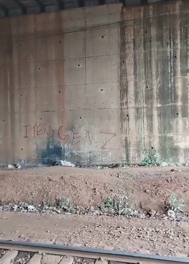 view under a concrete bridge, likely taken from a railroad track. The bridge's underside has parallel beams running across the top of the frame. The support wall is stained with vertical streaks of what appears to be water damage. The word "INTERGENZ" is spray-painted in red on the wall, and other graffiti in shades of gray and black are also present. A small mound of dirt and debris sits against the base of the wall, with some sparse vegetation growing on it. A railroad track runs along the bottom of the frame, complete with wooden ties and gravel ballast.