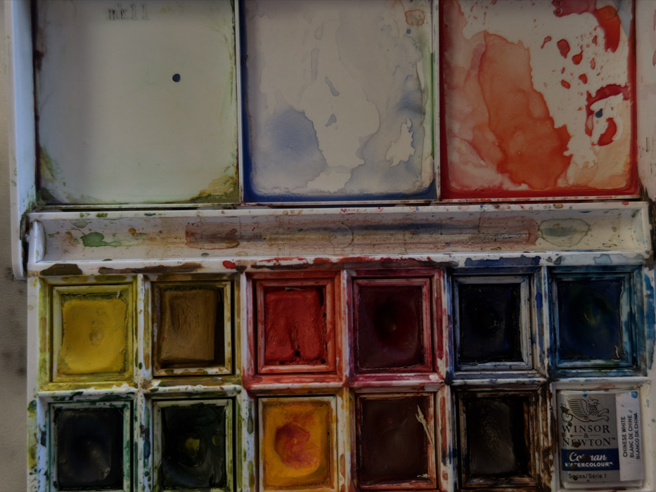 - "A well-used watercolor palette displays an array of colors in square compartments" by FM-Jgq9i1, licensed under CC BY 4.0