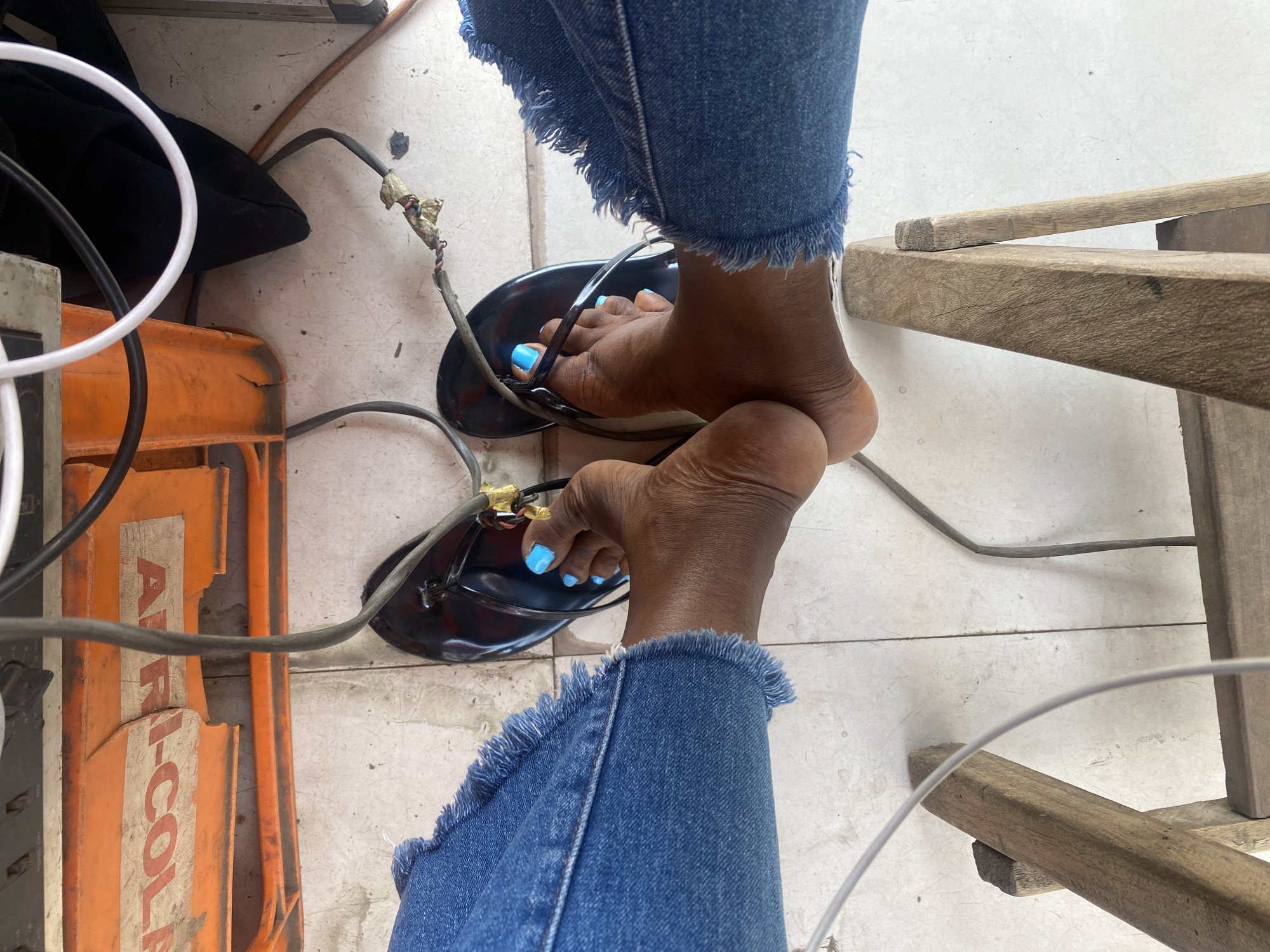A high-angle forensic shot captures a person's lower extremities within an indoor, tiled environment. The individual wears blue denim jeans with frayed hems. Both feet are visible; the left foot is bare with the heel slightly raised, while the right foot is partially inserted into a black, glossy, strap-style sandal. All visible toenails are painted bright blue. The floor consists of light-colored, possibly off-white, ceramic tiles with dark grout lines, showing minor scuffs and dirt. Beneath an unseen surface in the background, an orange, industrial-looking object is partially visible, bearing the white text "AFRI-COL" on its side, indicative of a brand often associated with cooling units or generators in Nigeria. Numerous electrical cables traverse the scene. A thick, dark grey insulated cable runs from behind the orange object, passing over the right foot's sandal. A segment of this grey cable near the right foot displays exposed, twisted copper wires, secured with beige adhesive tape, suggesting a makeshift repair. Other black and white cables are present in the upper right quadrant. At the bottom of the frame, two rough-hewn wooden elements, likely legs of a stool or small table, rest on the tiled floor. The scene depicts a practical, utilitarian setting consistent with a commercial establishment such as a small shop, workshop, or cyber cafe in a city like Ibadan, Nigeria, where "AFRI-COL" branded equipment and practical electrical solutions are common. The precise location within Ibadan is not identifiable from the visual evidence.
