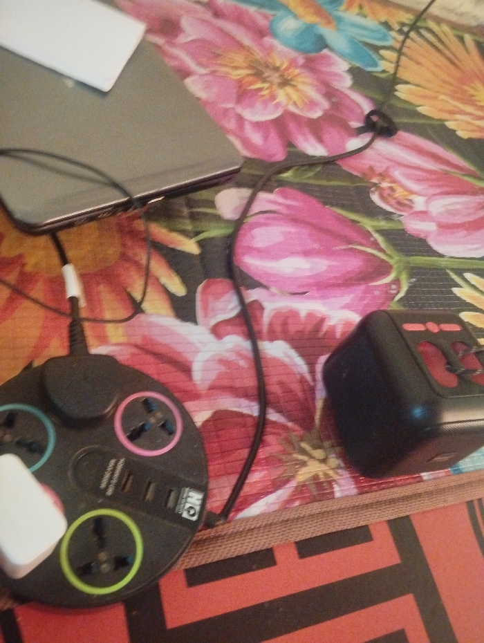 The scene depicts a collection of electronic devices and accessories situated on a patterned surface in Unguwan Rimi, Nigeria. A black, circular multi-socket extension cord, featuring four universal power outlets outlined in light blue, pink, and lime green, is centrally positioned. A white rectangular power adapter is plugged into the lime green-outlined outlet. The extension cord also includes three USB-A ports and one USB-C port, with an "HQ" logo visible. A black cable extends from the power strip. To the upper left, a dark grey smartphone or small tablet device rests, connected by a white-tipped charging cable to the power strip. A small, white rectangular object is placed on top of the device. To the right, a black, cube-shaped universal travel adapter with red accents is visible. The primary surface beneath these items is a vibrant floral pattern featuring large pink flowers, smaller blue and yellow flowers, and green leaves on a dark background. A portion of a red surface with a black geometric pattern is visible along the bottom right edge, beneath the floral pattern.