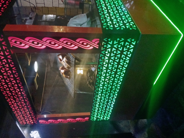 The image showcases a modern design element, possibly part of a building or display, featuring a combination of geometric patterns and neon lighting. A section is illuminated with bright green triangles, while another has a pink wave design. These are set against darker backgrounds and illuminated by internal or external lighting. The construction materials appear to be a mix of solid panels and intricately cut-out sections.