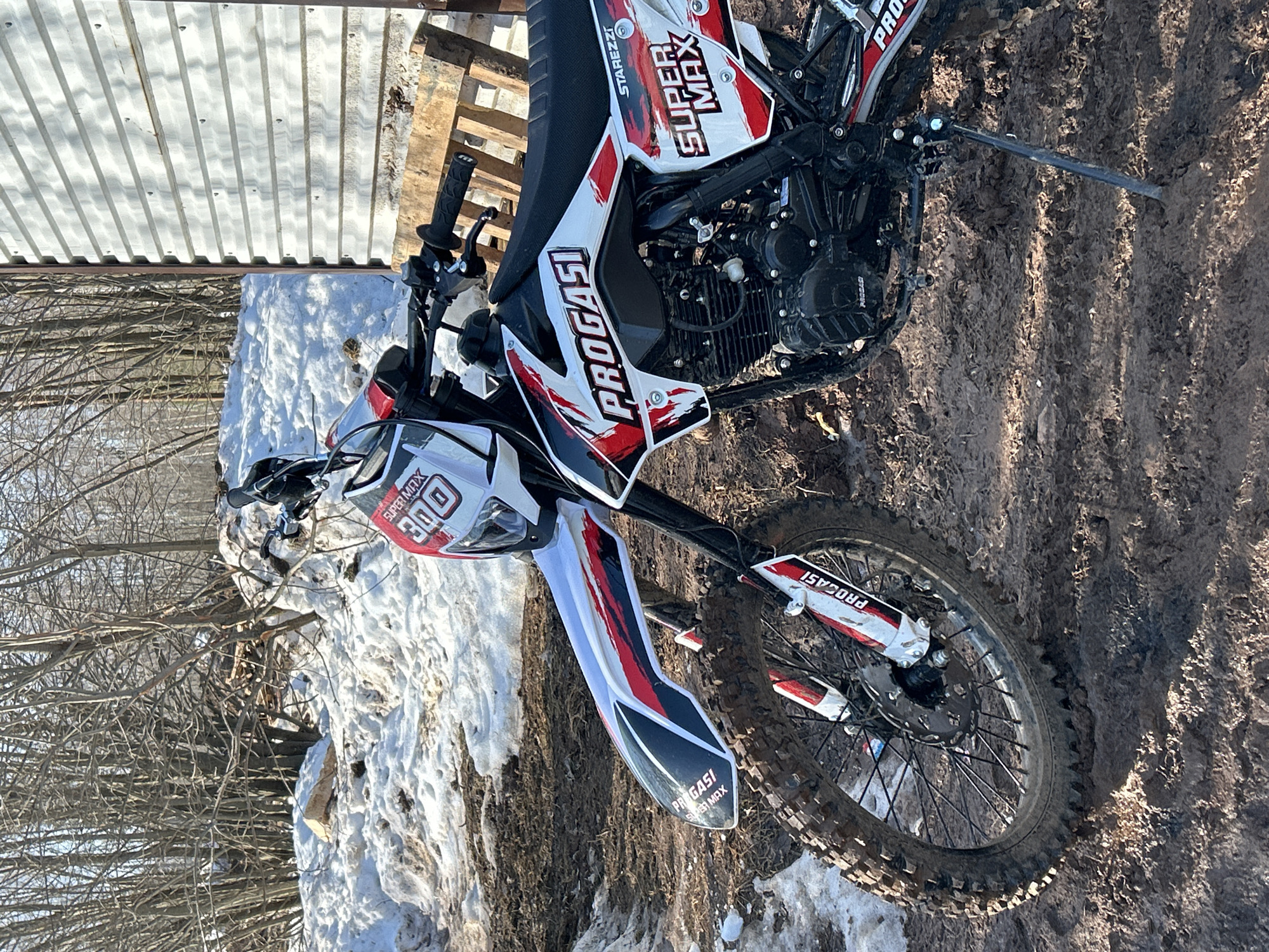 Progasi Super Max dirt bike parked on muddy ground near a snow-covered area, possibly in a rural or semi-rural location