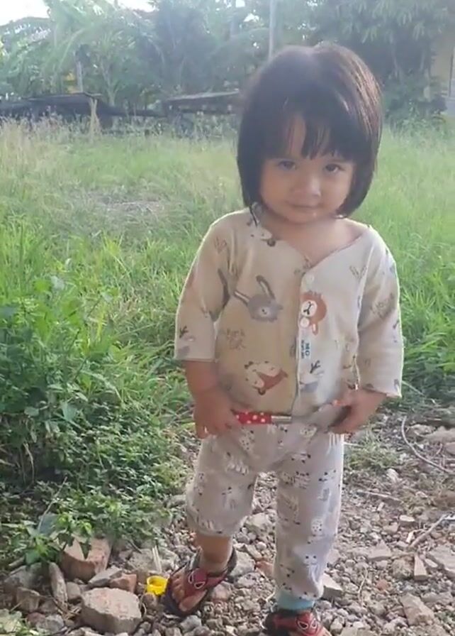 A young child with dark hair stands outdoors. She wears a printed long-sleeved top and printed leggings, along with red sandals. She holds a red and black screwdriver. She looks around, then crouches and touches a rock. The ground is covered in rocks and weeds. Behind her, there's a patch of grass and some trees.