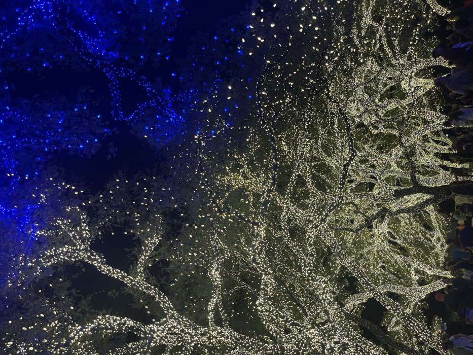 - "A tree is adorned with numerous strings of lights, predominantly white with a section illuminated in blue, creating a striking contrast" by FM-SFpYu2, licensed under CC BY 4.0