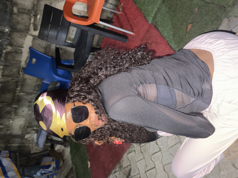 A person with curly hair, wearing a black see-through long-sleeved shirt, light-colored pants, and sunglasses, lies on an outdoor surface. They have a head covering with a pattern of dark purple and yellow. A blue plastic chair, a black metal chair, and a red rug are in the background. The ground is made of stone bricks and artificial grass. There are bags on the bottom-left corner.