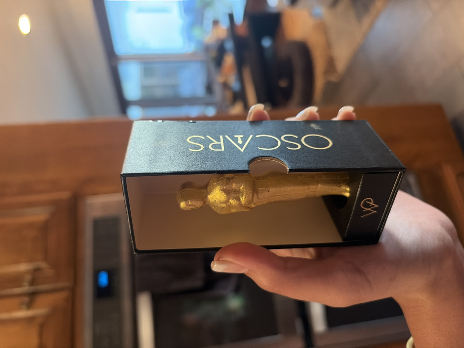 A right human hand, with manicured nails, holds an open-fronted black display box containing a miniature golden Oscar statuette