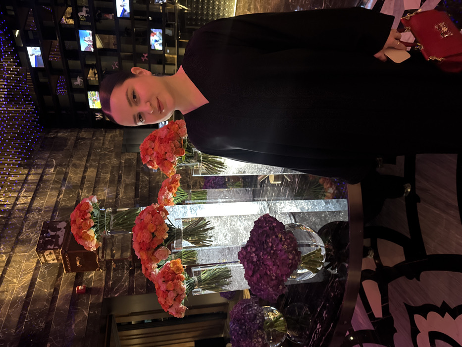 A woman stands beside a table decorated with floral arrangements in clear glass vases. The flowers are a mix of vibrant orange and purple. Behind the table, a wall of decorative displays includes illuminated images. The woman wears a dark garment and holds a red purse. The scene appears to be inside a luxurious restaurant or event venue.