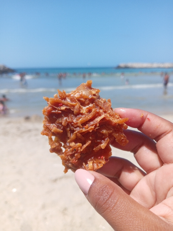 - "A close-up photograph displays a human hand holding a reddish-brown food item against a blurred background of a populated beach" by FM-I9zNR2, licensed under CC BY 4.0