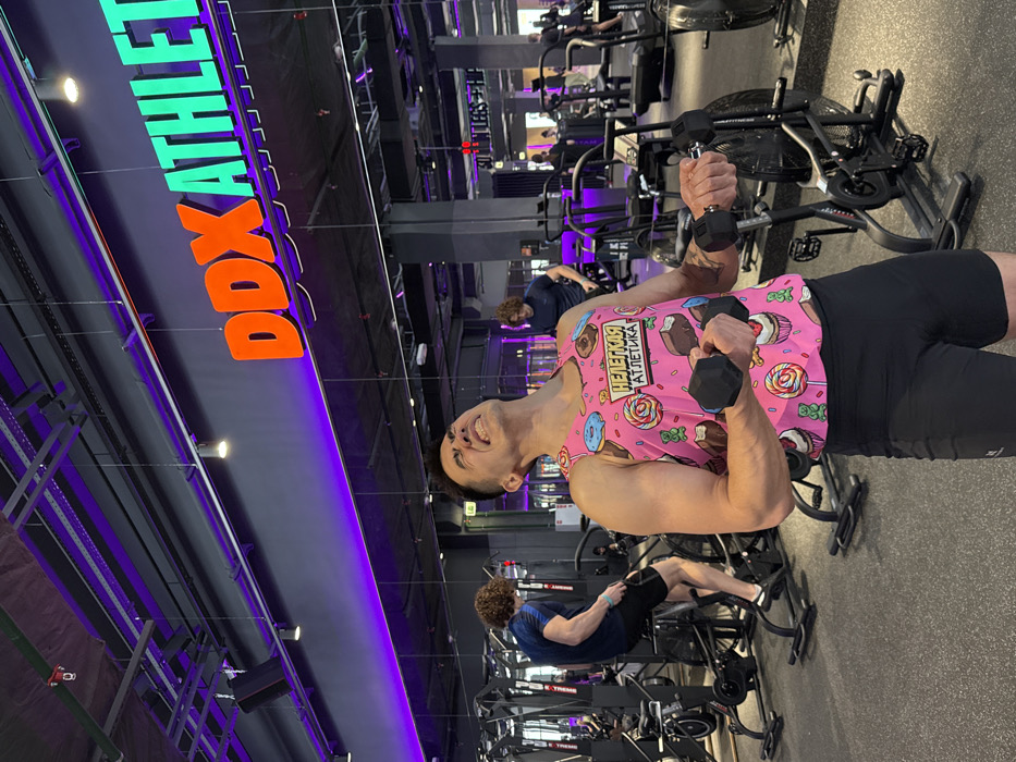 An East Asian male, mid-exercise, is centrally positioned within a modern fitness center identified as "DDX ATHLETICS" by a prominent orange and teal illuminated sign on a dark grey wall. The individual is performing bicep curls with a small, dark hexagonal dumbbell in each hand, his head tilted back and facial muscles visibly strained with effort. He wears a bright pink sleeveless tank top adorned with cartoon depictions of various desserts (donuts, cupcakes, gummy bears, chocolate bars) and the Russian text "НЕЛЕГКАЯ АТЛЕТИКА" (translating to "Difficult Athletics" or "Not Easy Athletics"). He is also wearing black athletic shorts. The gymnasium features a dark grey textured floor and an exposed industrial-style ceiling with visible pipes, conduits, and various track lighting fixtures, illuminated by purple LED strip lights. Mirrored walls reflect segments of the gym and its occupants. In the mid-ground, two other male individuals with curly brown hair are visible. One on the left, wearing a blue t-shirt and black shorts, is operating an air bike, facing away from the camera. Another male, further to the right, in a dark t-shirt, is also engaged with gym equipment. Additional indistinct figures and gym machinery are visible in the deeper background and reflections. The location is a DDX Fitness facility in the city of Kazan, Russia.