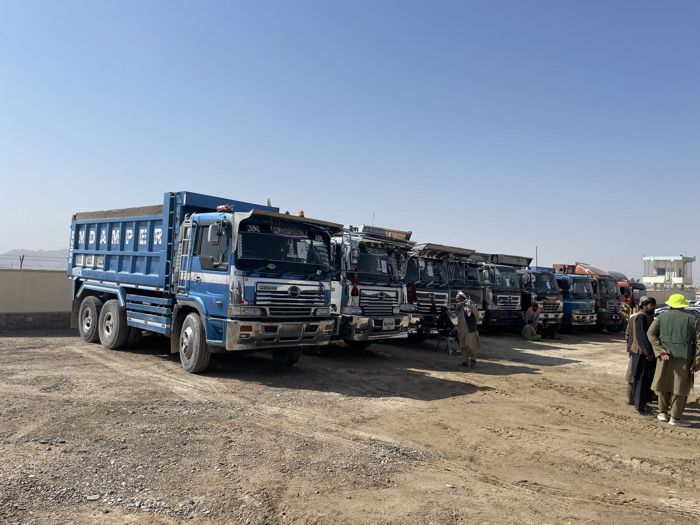 This image displays an outdoor truck lot in Pir Dust, Afghanistan, under a clear, pale blue sky