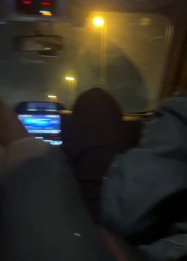 From a low angle inside a car at night, we see two people in the front seats. The person in the driver's seat wears a black hoodie. To their right, the other person has on a dark denim jacket. A car stereo is visible. Street lights pass by outside the car. The camera's view is dominated by the legs of the camera holder, who appears to be sitting in the back seat. The music is loud.