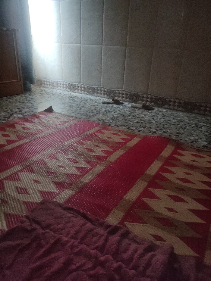 portion of a room with a red and brown rug. The rug has a patterned design and is made of a woven material. It lays on a granite floor with a grey, white, and brown tiled wall. There is a brown cloth laid out over the rug. The tiled wall has a decorative border. The room is located in Baghdad, Iraq, at the coordinates 33.351 latitude and 44.53 longitude. There are no people in the image.