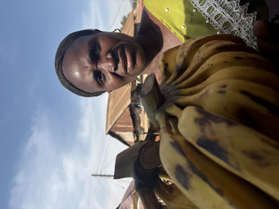 An adult female subject, with dark skin and a neutral expression, occupies the right side of the frame, looking directly at the viewer. She wears a dark, possibly sparkly headwrap and small gold hoop earrings. Her visible attire includes a lime-green garment with white lace trim featuring small white beads. A large bunch of ripe, yellow bananas with brown spots is positioned in the immediate foreground, partially obscuring the lower left portion of her body. The background, under a clear blue sky with scattered clouds, reveals a building with a rusty corrugated metal roof, a utility pole with multiple overhead wires, and a partial view of a patterned canopy on the far left. The scene is situated in Karshi, Nigeria.