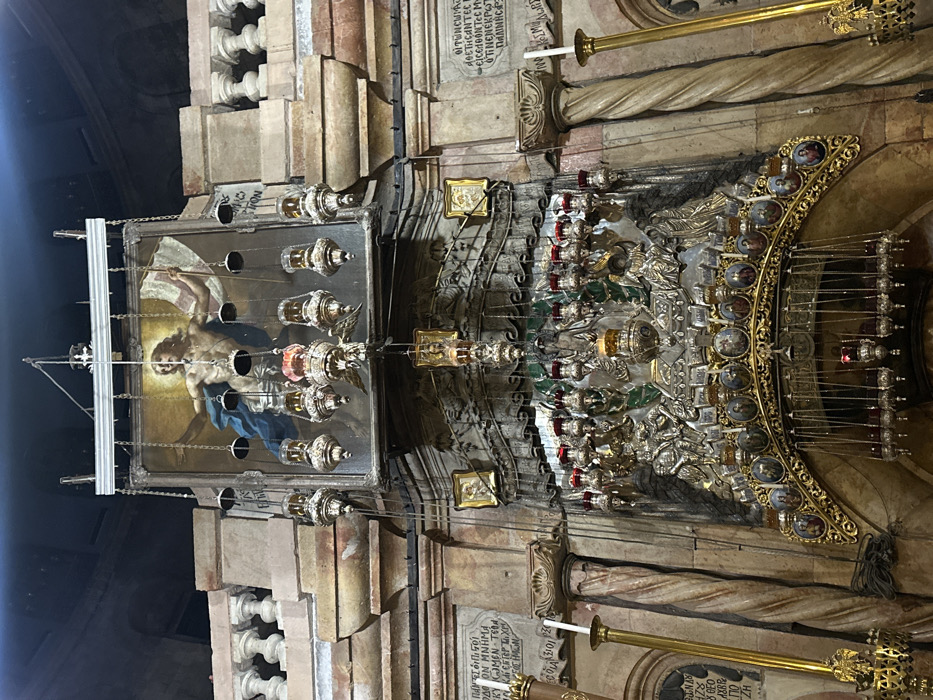 The image depicts a wall adorned with religious art and artifacts, likely inside a church or historical site. A painting showing a biblical figure is surrounded by hanging oil lamps. Ornate metalwork with intricate detailing and small icons is positioned nearby. Inscriptions in Greek characters appear on the stone wall. Gold candle stands are placed alongside the structures, suggesting a sacred or ceremonial setting. The overall scene reflects a rich history and cultural significance.