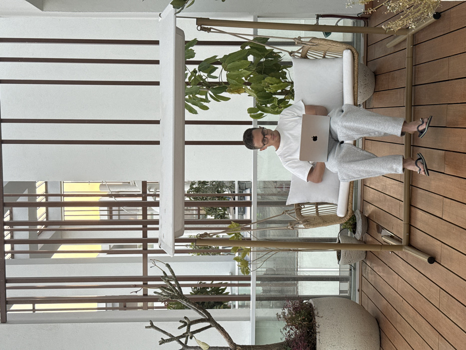 The scene depicts an outdoor balcony or terrace in Eilat, Israel, featuring a single adult male. The male, wearing clear-framed eyeglasses, a white t-shirt, light grey sweatpants, and black and white flip-flops, is seated on a light brown bamboo-framed swing chair equipped with white cushions and a white canopy. He is actively engaged with a silver Apple MacBook laptop positioned on his lap. The flooring consists of light brown wooden planks. Potted plants are distributed around the area, including a large grey pot with a sparse tree and reddish foliage to the left, and various green plants behind and to the right of the swing chair. The background reveals a white wall, a transparent glass railing, and a building structure with vertical brown slats and white supports, backlit by a prominent yellow-orange glow.
