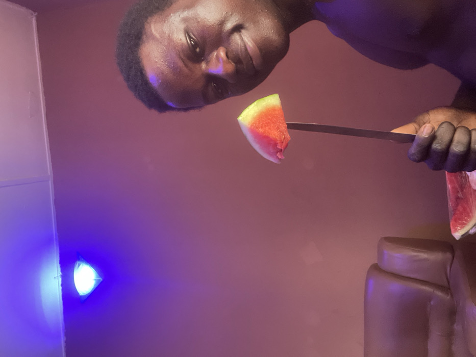 An indoor scene features a male subject positioned on the right, from the chest up, looking directly at the camera with a slight smile. He has dark skin and short, dark hair. His upper torso is visible, appearing bare or covered in dark clothing. He holds a partially consumed, triangular slice of watermelon impaled on a slender, dark stick or skewer, extending vertically from his right hand. In the lower-left, a larger watermelon slice rests on an unseen surface. Behind these, a segment of a brown upholstered chair or couch is visible. The background wall is a solid reddish-purple, illuminated in part by a distinct blue light emitted from a wall-mounted triangular fixture in the upper-left corner. The ceiling is white. The image contains no discernible visual elements to confirm the stated location as Ajara, Nigeria.