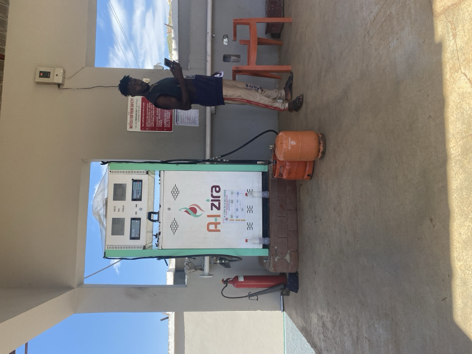 The image depicts a gas station in Gwong, Nigeria, under a concrete canopy. A light green and white "A-I zira Oil & Gas Limited" fuel pump with digital displays (showing 0.00 and 24.50) stands on a low brick base. Two orange LPG cylinders are positioned on the concrete floor in front of the pump, alongside two clear plastic bottles on the pump's base. A red fire extinguisher is located to the left of the pump. An adult male with dark skin and dreadlocks, wearing a dark sleeveless top, light-colored track pants with dark stripes, and dark sandals, stands to the right of the pump, holding a dark smartphone in both hands. A "NOTICE FOR YOUR SAFETY" sign is affixed to the wall behind him. A reddish-orange plastic chair is situated further to the right. The background shows a clear blue sky with some clouds and what appears to be a barbed wire fence.