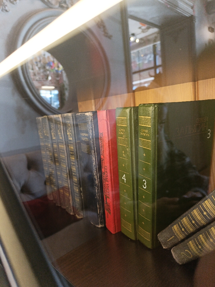 The image displays a collection of books housed within a display case or behind a glass barrier, situated indoors in Yevpatoriya, Ukraine. Approximately ten to twelve books stand upright on a dark brown shelf. The books have varied spine colors, including several faded dark blue/black, a singular bright red, and two distinct green volumes. Visible Cyrillic text on the red spine reads "Капитаны дальнего плавания" (Captains of Long Voyages), while the green spines clearly state "СЕРГЕЙ ЗАЛЫГИН" (SERGEI ZALYGIN) with volume numbers "4" and "3" respectively. Two additional books, dark with golden spine-end accents, are partially visible lying horizontally in the bottom right. A prominent horizontal light streak, indicative of a linear light source, reflects across the upper portion of the glass. The reflective surface also reveals elements of the surrounding room: a large, ornate, circular frame or mirror in the upper left quadrant, blurred interior features suggesting additional shelving or decor, and a faint, indistinct human reflection on the glass and the surface of the rightmost green book.