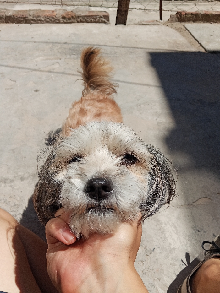 A small, tan and white dog is shown close up, head tilted towards the camera. A person's hand is holding the dog's head, with the person's leg and shoe visible on the bottom right. The dog's fur is mostly white around the face, transitioning to tan on the body. The background is a concrete surface, partially shaded, with a brick wall visible in the top left corner. The dog's tail is slightly raised.