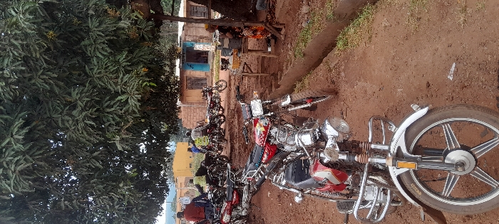 The scene depicts an unpaved, reddish-brown dirt thoroughfare in Tuaniako, Nigeria. A large, green-leafed tree dominates the upper frame, casting shadows over the area. Approximately 10-15 motorcycles, predominantly red and white models with chrome components, are parked or arranged across the dirt surface; a red and white model with a chrome headlight and a star-spoke front wheel is prominent in the immediate foreground. In the mid-ground, several individuals, primarily adult males in casual attire, are standing amongst the motorcycles. To the far right, a female individual, wearing an orange and black patterned garment and a yellow headscarf, stands behind two wooden tables displaying various objects, indicative of a vendor stall. In the background, a light yellow-orange building and a brown structure with a blue door are visible, with distant hills on the horizon. A linear concrete or earthen drainage channel runs parallel to the dirt path on the right.
