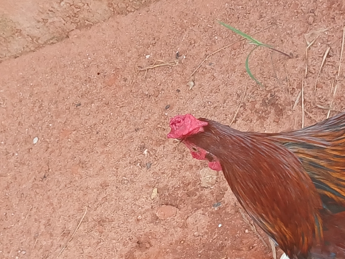 - "A high-angle, close-up photograph depicts the upper body and head of a rooster on dry, reddish-brown granular soil in Idah, Nigeria" by FM-Oh2n63, licensed under CC BY 4.0